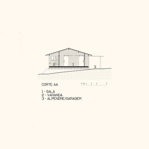 Buscando inspirações nas vernaculares tipologias da Casa Bandeirista (ver casa de Padre Ignacio) e sua equivalente paraguaia, kulata jovai, foi adotado o recurso de intercalar maciços estruturais com vazios. No entanto nessa residência em vez de apenas dois blocos edificados, como é nessas tipologias tradicionais, temos cinco elementos sobre os quais pousa a leve laje de piso e o onipresente telhado cerâmico (favorecido pela ausência de caixa d’água sobre a casa - uma das vantagens dos terrenos em declive). Os vazios que permeiam os blocos edificados foram fechados por painéis leves de madeira (sempre recuados, para uma maior proteção com relação à umidade) e grandes portas de vidro, criando independência entre estrutura e vedação.